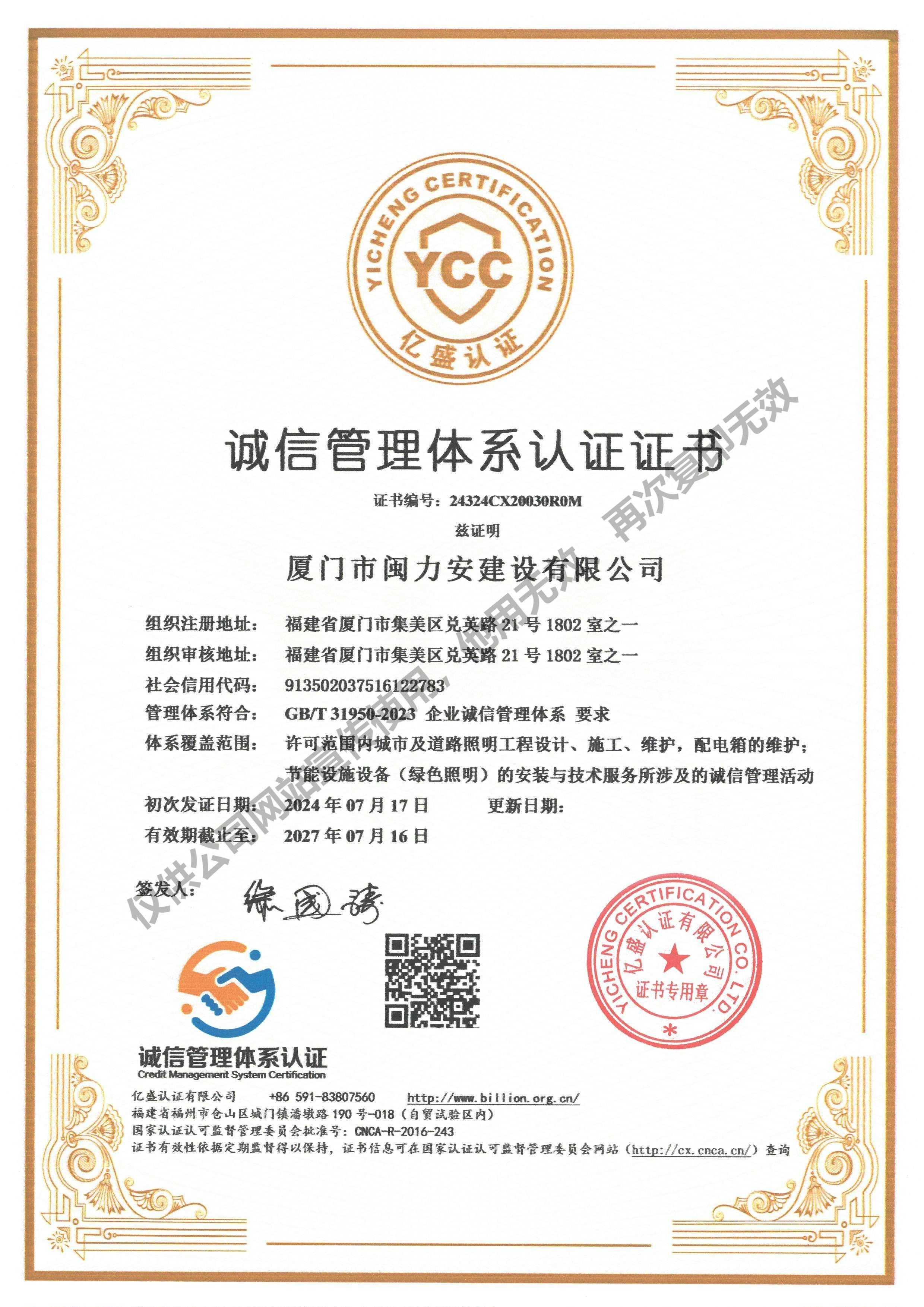 廈門市閩力安建設(shè)有限公司成立于2003年,公司取得市政公用工程施工總承包貳級、建筑裝修裝飾工程專業(yè)承包壹級、城市及道路照明工程專業(yè)承包壹級、電子與智能化工程專業(yè)承包貳級、消防設(shè)施工程專業(yè)承包貳級、電力工程施工總承包叁級、建筑機電安裝工程專業(yè)承包叁級、輸變電工程專業(yè)承包叁級、環(huán)保工程專業(yè)承包叁級、照明工程設(shè)計專項甲級、建筑裝飾工程設(shè)計乙級、施工勞務(wù)等資質(zhì)的綜合型企業(yè),公司于2013年通過了ISO9001質(zhì)量體系認證,ISO14001環(huán)境管理體系認證,OHSAS18001職業(yè)健康安全管理體系認證。
